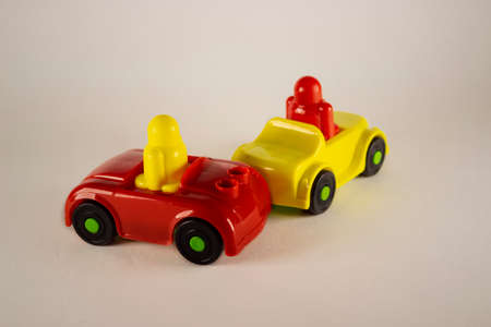 Two desperate men in toy cars involved in accident, conceptual image with miniatures and figurines on white background. Close-up of a collision of two toy cars on a white background
