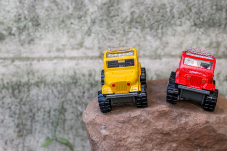 Two miniature 4x4 pickup trucks, yellow and red, parked close together on rocky brown terrain, simulating adventure. Shot from above with clear space for text on the left.