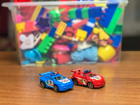 A red toy car placed on a wooden table, with colorful blocks in the background, creating a playful scene