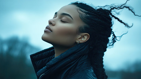 A serene portrait of a woman with natural hair wearing a stylish black jacket, capturing a moment of contemplation amidst a dramatic cloudy sky.