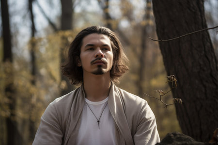 A practicing slow breathing with a relaxed expression, embodying peace and mindfulness in a tranquil setting.