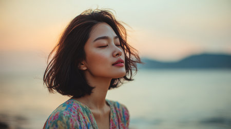 An Asian woman with smooth tan skin and shoulder-length hair enjoys the sea breeze at sunrise. She wears a pastel dress, eyes closed, creating a calm and spiritual atmosphere.