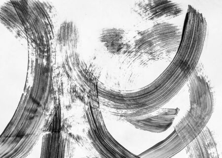 Close-up of black brushstrokes on a white background. Abstract mystical background. A backdrop for the design. The brush strokes are textural and messy. The strokes are very dense and bold, which gives the painting a sense of movement and energy