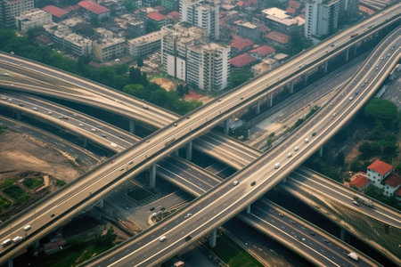 A top-view perspective of an elevated highway interchange, showing its modern design and infrastructure. Generative AI