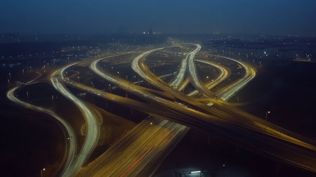 Generative AI High-altitude shots displaying a highway interchange during rush hour, highlighting the movement of vehicles.