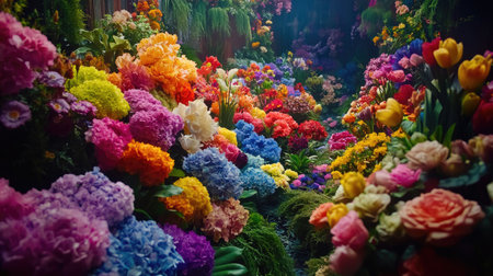 Beautiful and diverse assortment of vibrant multicolored blooms in a botanical garden, creating a stunning natural mosaic pattern, perfect for summer and spring celebrations