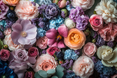 A vivid assortment of various flowers including roses, chrysanthemums, daisies, and hydrangeas creating a beautiful, colorful floral pattern. ideal for botanical art prints, greeting cards, and posters, this arrangement embodies the essence of nature s beauty. Generative AI