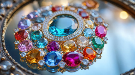 Experience the allure of luxury with this close-up image of a stunning jewelry piece featuring a vibrant array of gemstones surrounded by diamonds.