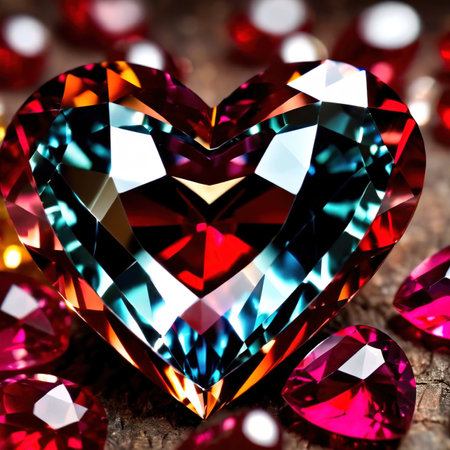 Colorful heart shape gemstone on dark background with bokeh