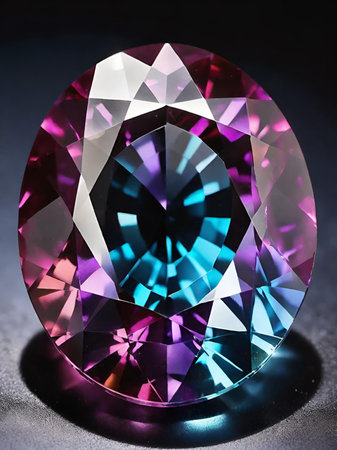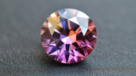 A stunning round cut gemstone exhibits a mesmerizing blend of purple and pink hues, perfectly cut for maximum brilliance and sparkle against a dark background.