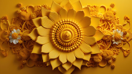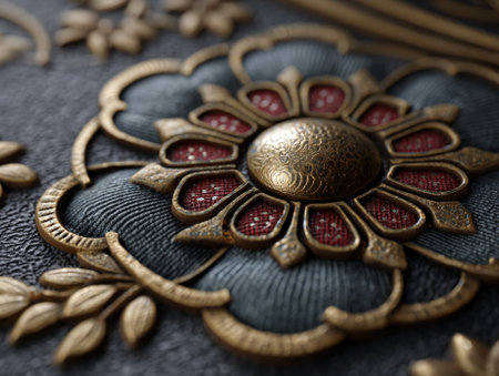 Ornate design featuring a central embossed golden medallion with intricate patterns, surrounded by petals in dark blue, gold, and red textured details, resembling a floral motif
