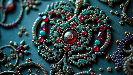 Intricate vintage jewelry with red and blue gems on dark surface. That the image is generated using AI.