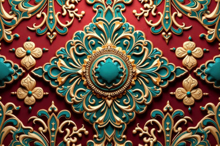 Ornate gold and teal floral pattern on red background. That the image is generated using AI.