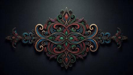 An elaborate decorative flourish with intricate swirling filigree in gold, red, blue, and green, set against a dark, textured background.