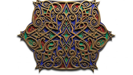 An ornate, golden geometric emblem with intricate red, blue, and green inlays, presented on a white background with a subtle shadow.