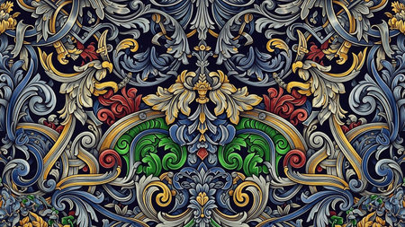An ornate baroque pattern featuring detailed floral and scrollwork motifs in rich colors like blue, gold, green, and red on a dark background.