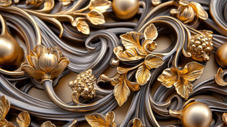Gorgeous golden floral designs adorn a dark surface, revealing exquisite details and craftsmanship. The interplay of light and shadow enhances the rich, opulent appearance of the artwork.