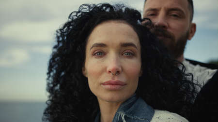 Couple looking camera on sea beach nature background. Portrait of mixed race lovers hugging on family trip. Close up two calm people face enjoy ocean view. Beautiful romantic vacation together concept
