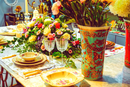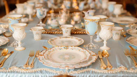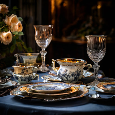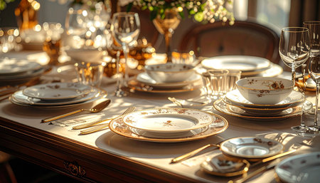 An exquisite table setting showcases fine glassware, patterned plates, and polished silverware. The warm lighting suggests an indoor setting, possibly during a special event or celebration. The composition highlights textures and colors, offering visual interest suitable for editorial or commercial applications.