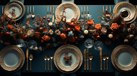 Aesthetically designed table with antique china and gold cutlery. Festive dinner concept. View from above. Generative AI