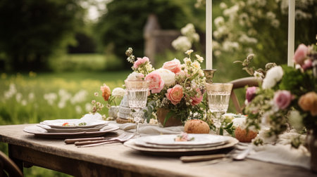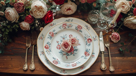 A charming and elegant table setting featuring vintage floral plates and glassware, complemented by a beautiful flower centerpiece on a rustic wooden table, perfect for special occasions.