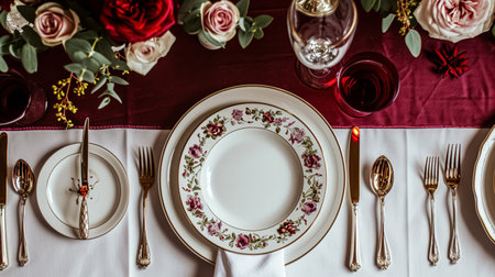 This stunning table setting features an elegant arrangement of red floral decor and fine china dinnerware, creating a luxurious dining ambiance perfect for special occasions.