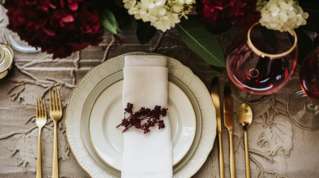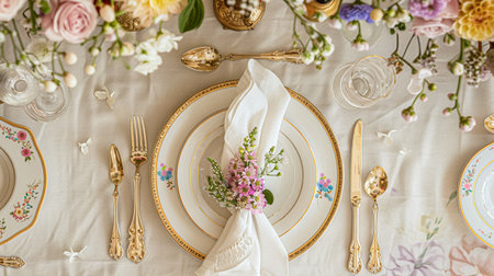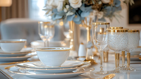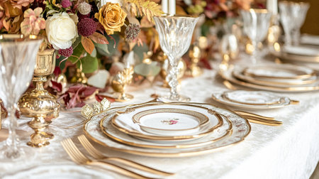 This stunning image showcases an elegant dining table set with exquisite china and beautiful floral arrangements. The luxurious golden accents enhance the sophisticated ambiance, creating a perfect setting for a gourmet meal or celebration.
