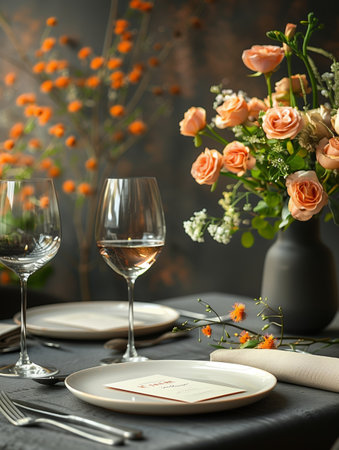 Elegant Dinner Setting With Peach Roses and Wine Glasses