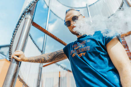 Close-up, portrait of a young guy wearing a cap and sunglasses with a beard and mustache in tattoos, exhaling smoke from a cigarette