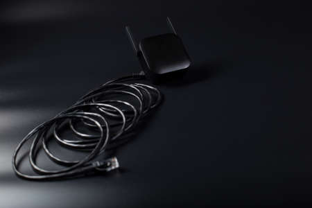 Small black wifi router close up with patch cord on black background with copy space.