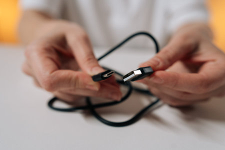 Close-up hands of unrecognizable person untangling knotted black power cord sitting at white table, preparing charging cable for use and restoring order to tangled wire.