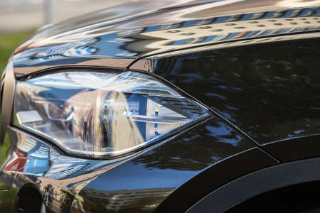 Close up of modern sedan headlamp. Front view shot from side of vehicle. Car headlight background.