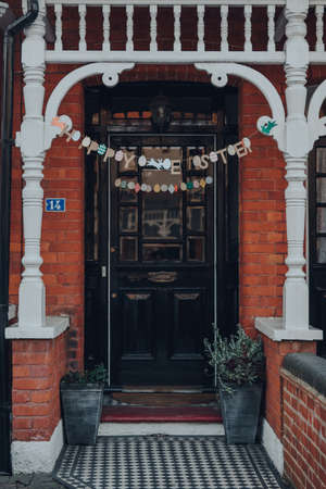 London, UK - April 12, 2020: Happy Easter garland on a facade of a traditional Edwardian house in London, selective focus. Edwardian houses promote simple design and an appreciation for the handmade.