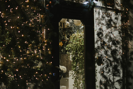 Beautiful entrance decorated for holidays, featuring a welcoming wreath, a twinkling tree, and warm lights, creating a cozy atmosphere for celebration.