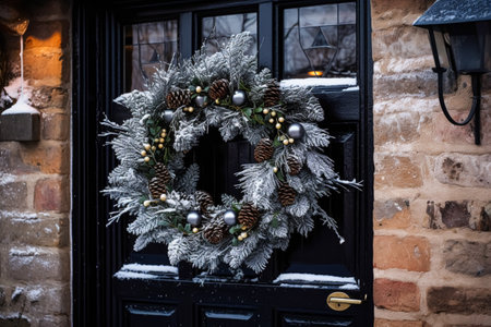 Christmas holiday, country cottage and snowing winter, wreath decoration on a door, Merry Christmas and Happy Holidays wishes, post-processed, generative ai