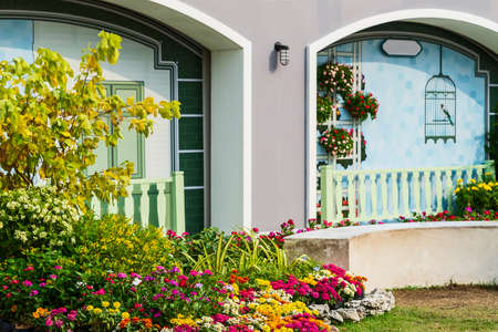 Colorful flowers garden outside house.