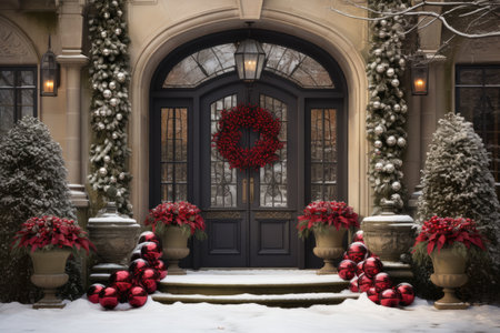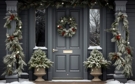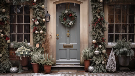 House door and entrance in a Californian setting are adorned with festive Christmas decorations, AI-generated image