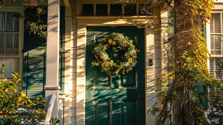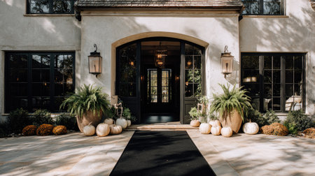 An inviting house entrance is adorned with seasonal decorations, including pumpkins and planters with greenery. The composition showcases a symmetrical design, with a focus on architectural details and natural light. This image is suitable for various commercial purposes, such as illustrating home design, seasonal themes, or lifestyle content.