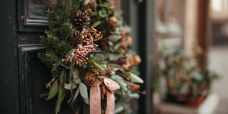 Wreath with pinecones and greenery on a door during holiday season in an urban area