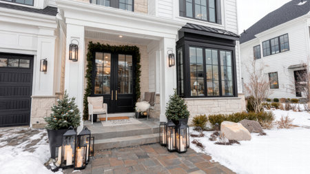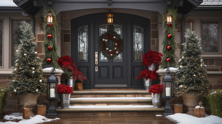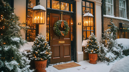 Elegant holiday decorations adorn a welcoming door, with a wreath and illuminated lanterns. Snow blankets the ground and evergreen trees create a picturesque winter scene.