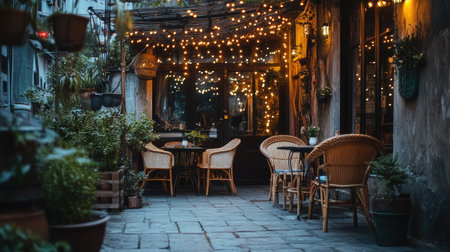 A charming caf patio adorned with fairy lights, wicker chairs, and potted plants, nestled in a quiet corner of a bustling city.