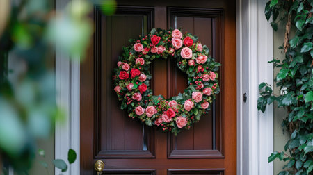 A home entrance with an artificial rose wreath hanging on the door, creating a welcoming atmosphere
