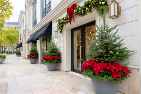 Stylish christmas mistletoe branches with golden festive lights on window store at holiday market in city street. Christmas street decor. Space for text.