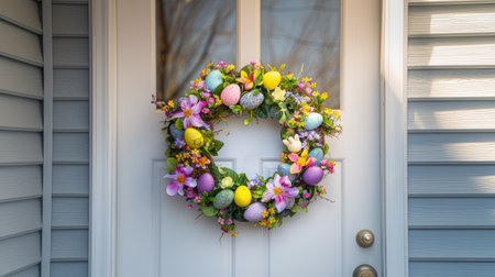 Easter-themed front porch with pastel eggs, floral wreath, and bunny decorations