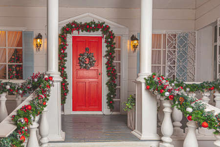Christmas porch decoration idea. House entrance with red door decorated for holidays. Red and green wreath garland of fir tree branches and lights on railing. Christmas eve at home.