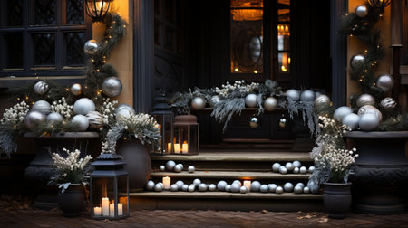 Stylish christmas silver and gold baubles and fir branches on building exterior. Modern christmas decor in city street. Winter holidays in Europe. Merry Christmas