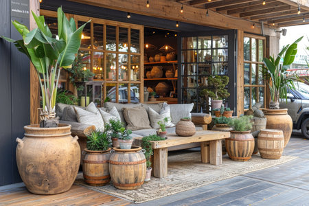 Beautiful backyard terrace full of furniture and decorative plants