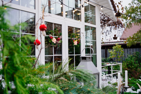 Winter holiday window decorated with fresh greens, red berries, cones and flowers. Outdoor exterior decoration made of natural materials. Christmas festive city. Selective focus.