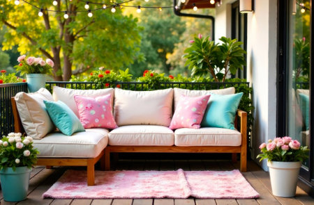 Vibrant cushions on a cozy outdoor sofa, nestled among lush greenery and flowers in the evening glow