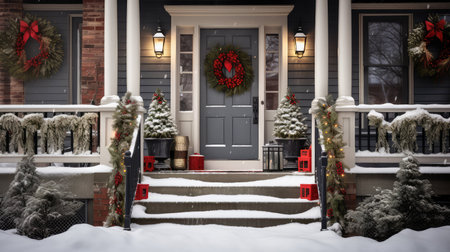 A welcoming house entrance adorned with festive decorations and lights in the snow.